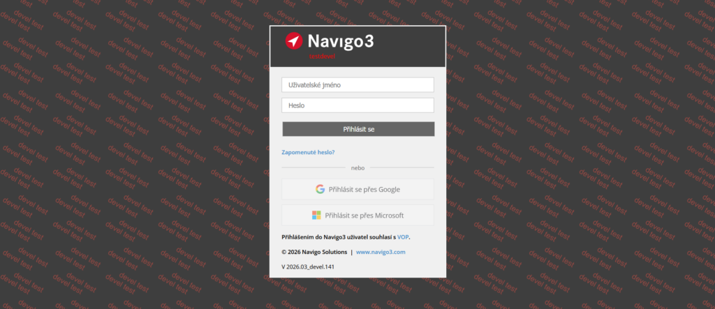 Způsob přihlašování vám smí aktuálně změnit pouze naše podpora, proto nás v případě zájmu o využití této funkce kontaktujte na podpora@navigo3.com. V budoucnu bude možnost měnit způsob přihlášení zpřístupněna uživatelům s právem „Superuživatel“.