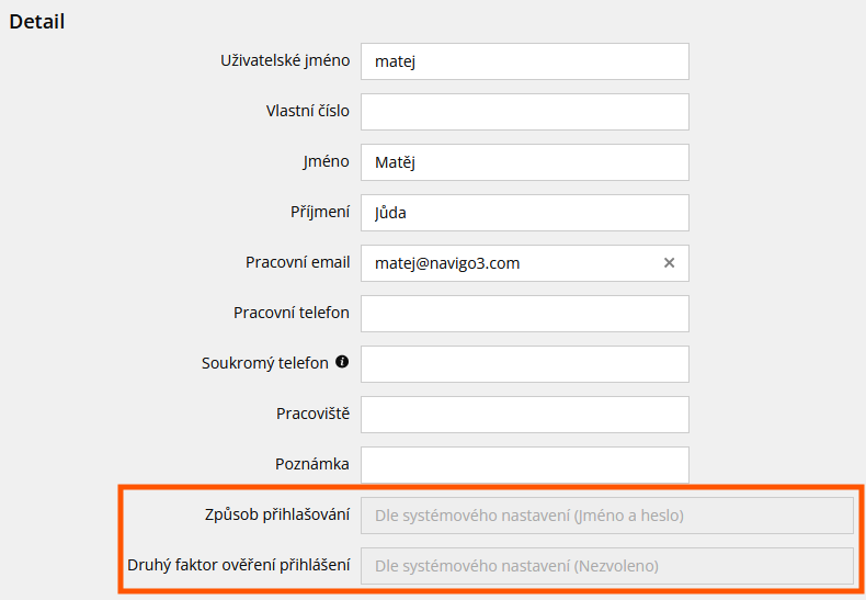 Pro správné fungování nových metod přihlašování (Google, Office 365 nebo dvoufázové ověření) je potřeba, aby měli všichni uživatelé s těmito způsoby přihlašování vyplněnou platnou e-mailovou adresu (Detail uživatele, pole Pracovní email).