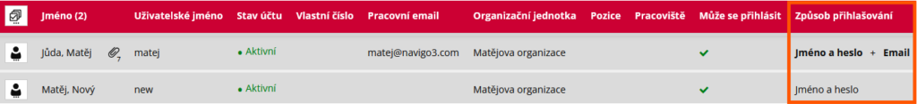 Novinkou na seznamu je sloupec „Způsob přihlašování“, kde vidíte, jakou formu přihlášení daný uživatel využívá. Tučně jsou vyznačeny ty způsoby, které má uživatel nastavené individuálně.